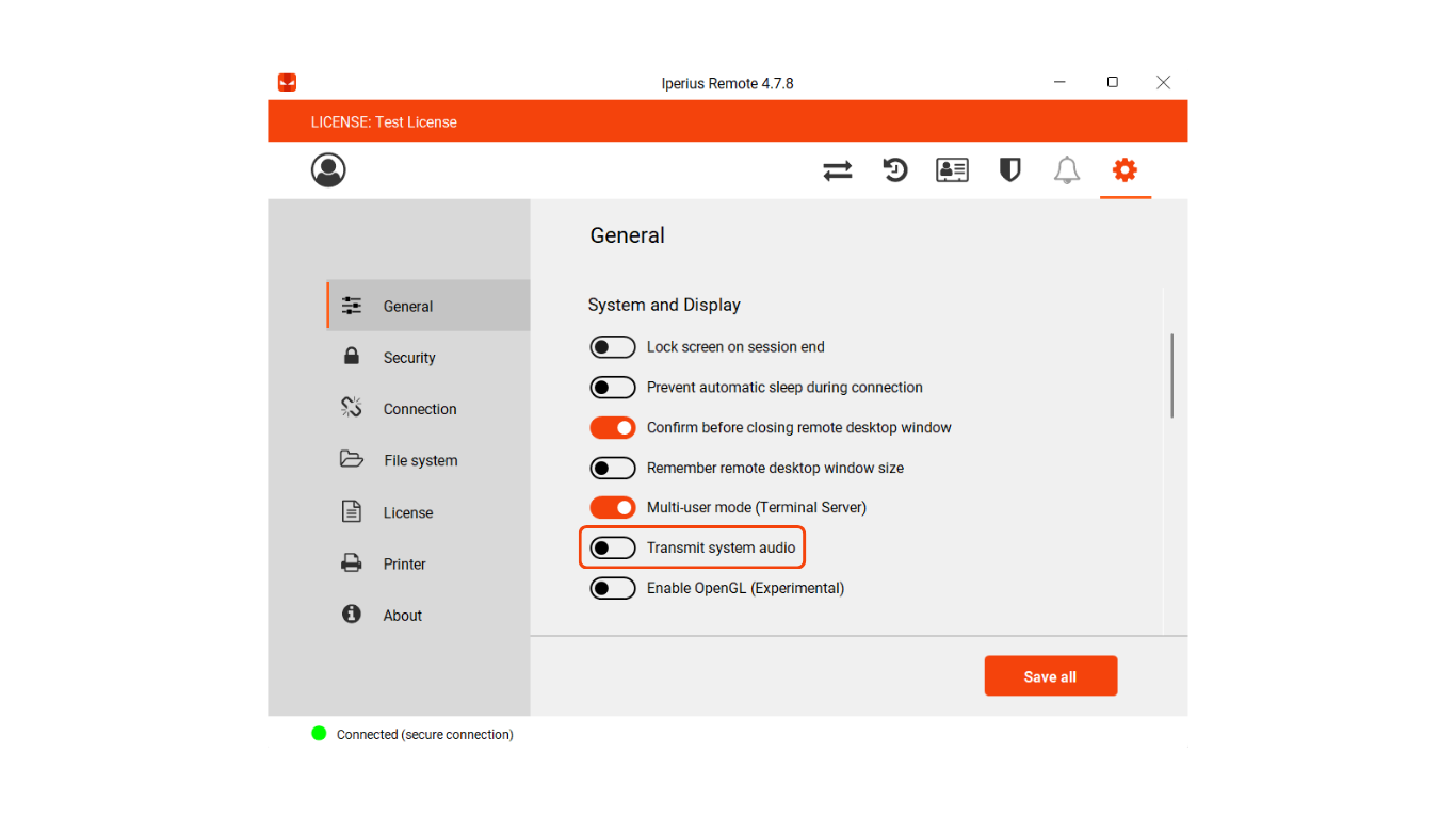 With Iperius Remote , audio transmission allows you to listen to the sounds of the remote system in real time during a remote control session, improving the experience of technical assistance, training and remote collaboration.