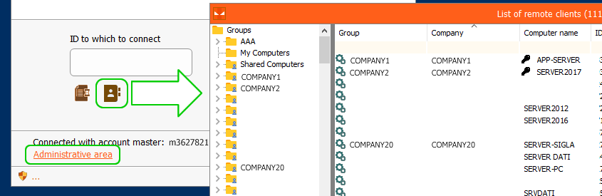 Once the Master account has been inserted, click on "Save" and close the settings window. A new button is now displayed next to the "Connect" button (and the history button). All the connected computers can be seen by clicking on this button (those on which the Client account has been inserted).
